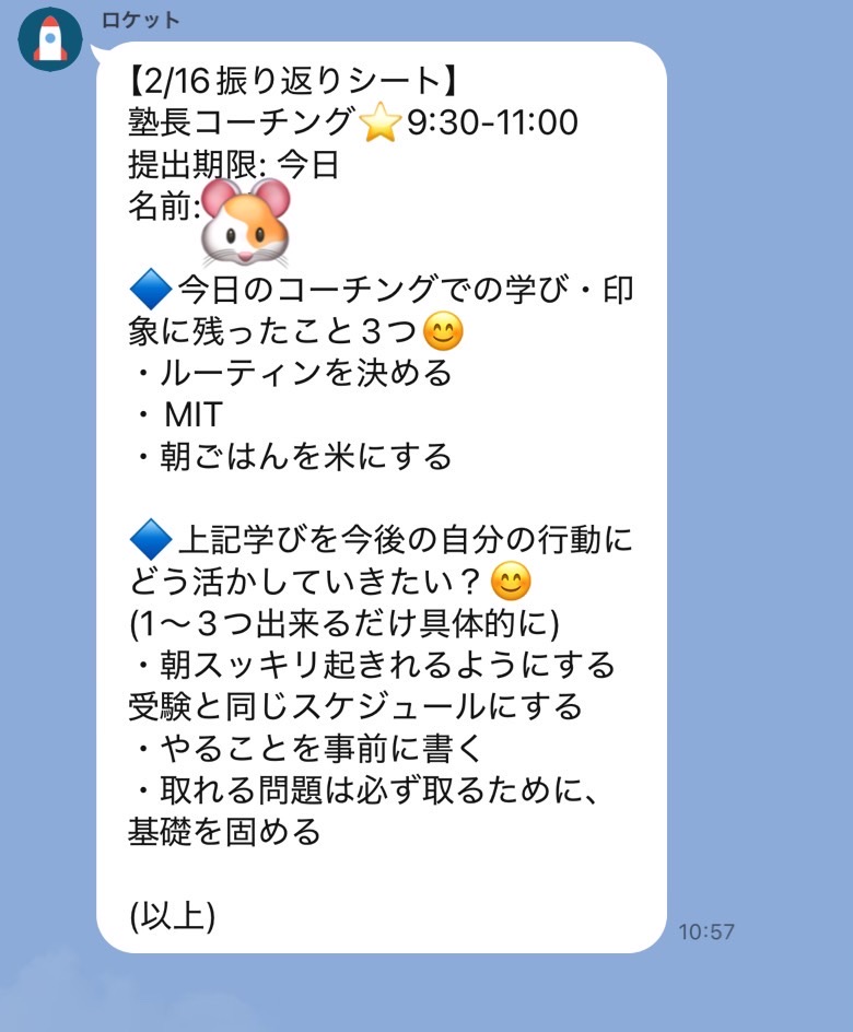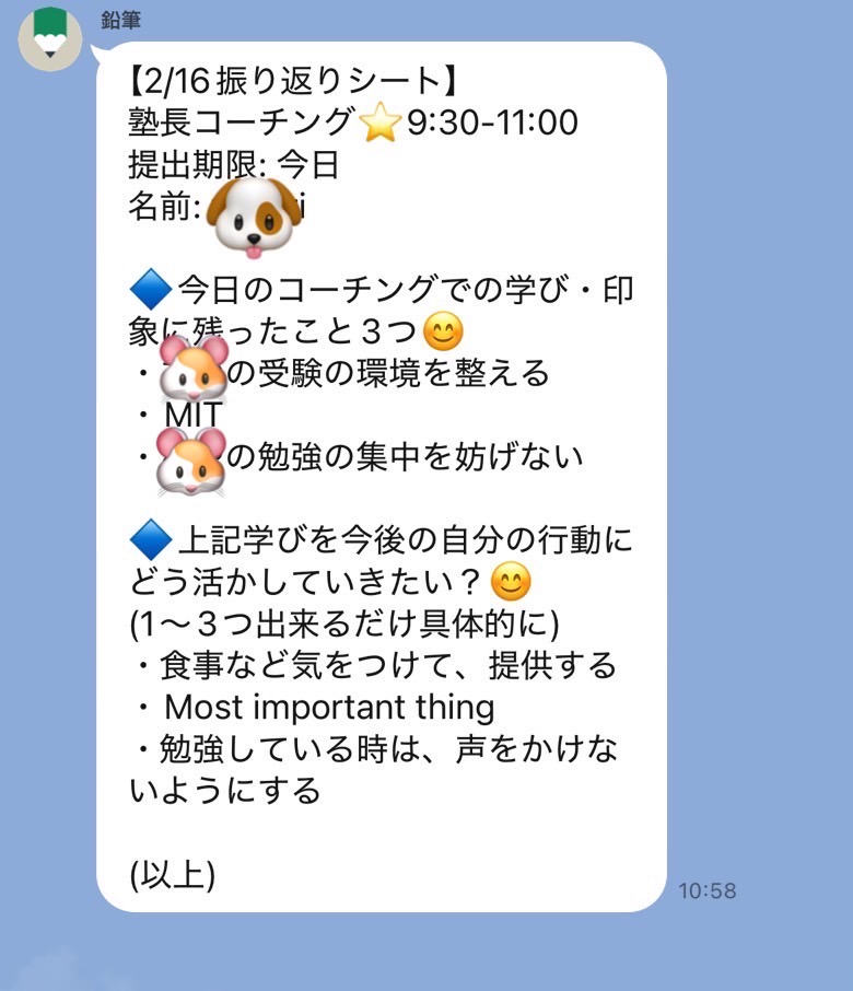 中3受験生お嬢様とお母様に対し、ご自宅にて受験直前期の勉強に対する心構えとスケジュール、また朝型の生活リズムと朝食の改善など、受験前日までベストを尽くせるようなトータルコーチングとなりました!You can do it!!